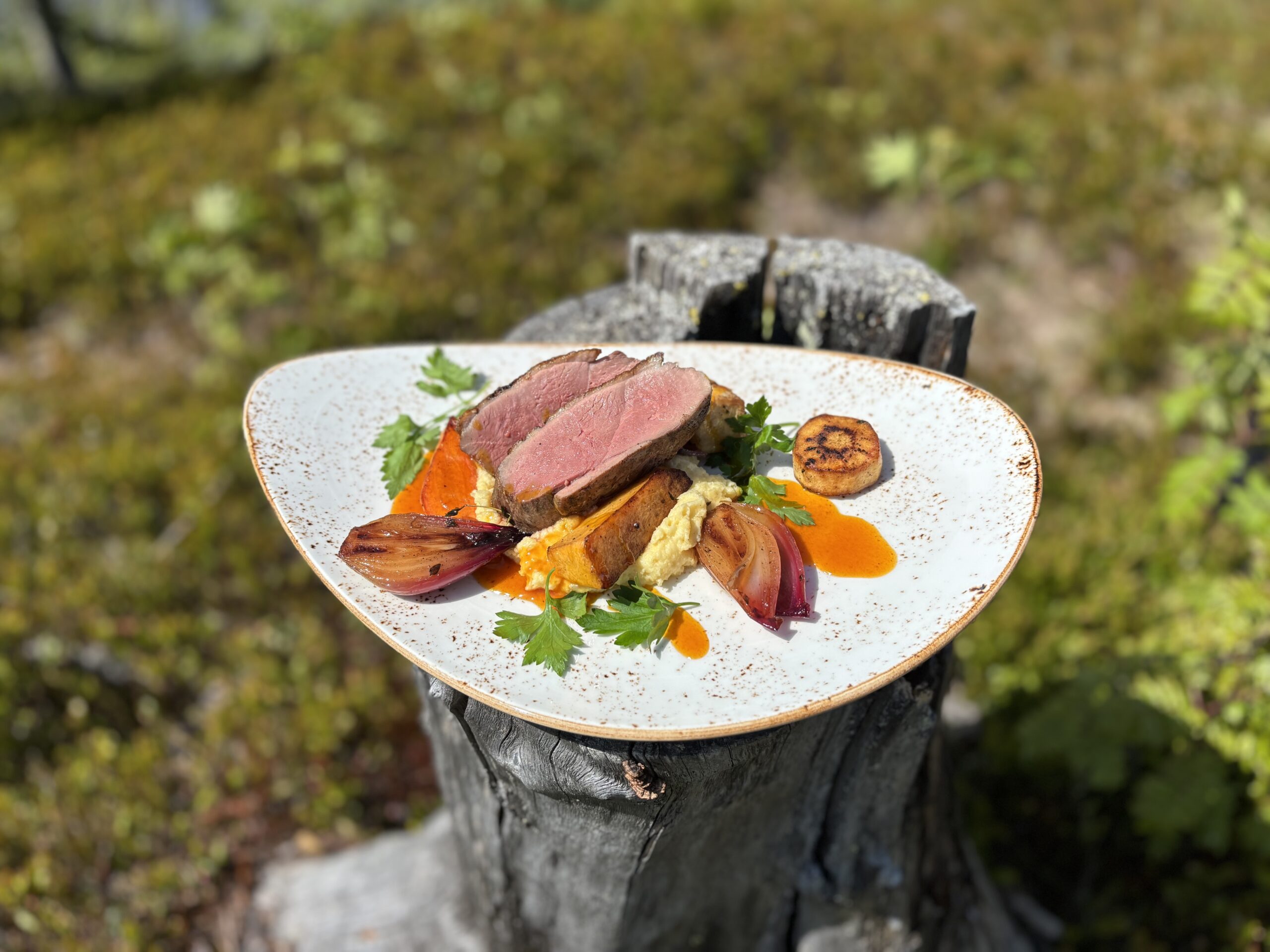 Inneholder: melk. - Flatbiff av reinsdyr fra Arv, helkaramellisert persillerot, gulrotpure, sylta rød delikatesseløk, kremet portvinssaus og røstipoteter.